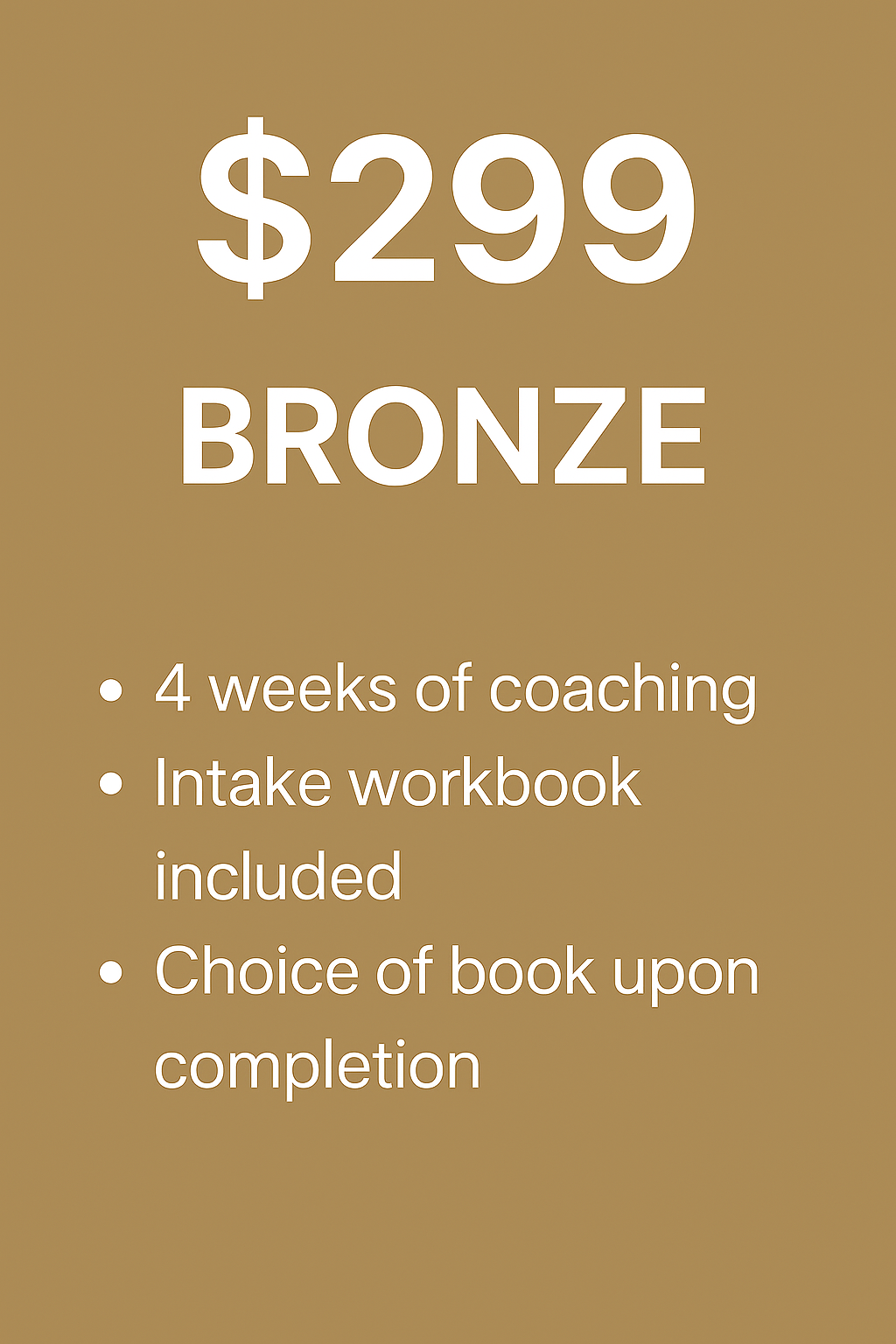 π₯ Bronze Package: Foundation Starter Price: $1000 Duration: 4 Weeks Includes: 1-on-1 Coaching "Weekly 30-minute Coaching Session" Clarity sessions for Life or Entrepreneurial direction